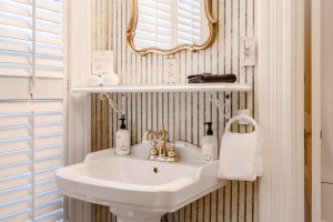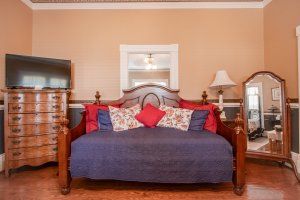 Originally the master dining room, this room has been converted into a true master suite of comfort and class. A magnificent wrought iron king bed awaits you just steps from the front porch and parlor. A twin daybed for your lounging comfort can be made up for an additional guest. Beautiful views of the back garden. The original butler’s pantry was converted into a large master bath with a single jacuzzi jetted tub and shower. Handrails are fully installed for your comfort and ease of accessing the single shower/tub. This magnificent room is filled with the original crown molding, traditional wall rails, and a view of the gardens. All rooms are wifi accessible and have updated new amenities to keep you connected in the current world while you relax back in timeless luxury.