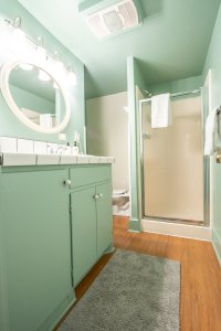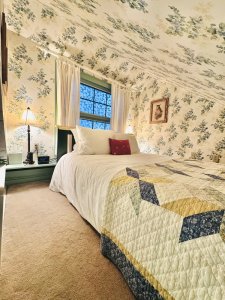 The Garden Cottage Gazebo offers our most private space featuring two queen beds and a wrap-around patio. One of the queen beds is on the main level and the other is accessible via steps (note: the steps are steep – see picture). The bathroom features a walk-in shower and the only sauna on the property. The Cottage includes a small kitchen with a microwave, mini refrigerator, and Keurig coffee maker. Enjoy the perks of privacy while still having access to all of the amenities of the main house.