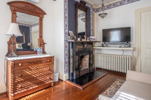 Historically known as The Major’s Study, overseeing the mass front grounds and flowerbeds from the three huge windows on the second floor. Softly decorated with lush bedding and a romantic gas fireplace to add a warm touch to your stay. Steps from the second-floor deck to view sunsets or early bird sunrises. Private hallway leading to an updated bath with full tub and shower. Unique back access to the private staircase leading down to the first floor. The bath is private and only a few steps along a short hallway, accessible only to you. All rooms are wifi accessible and have updated new amenities to keep you connected in the current world while you relax back in timeless luxury.